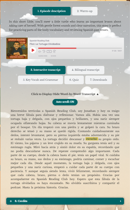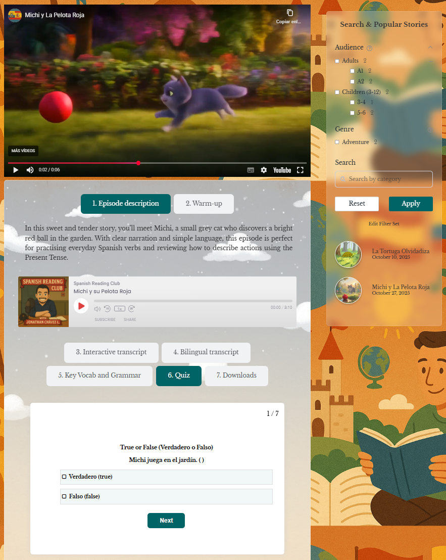 Each story comes with a downloadable worksheet full of vocabulary practice, grammar tips, and comprehension activities to reinforce what you’ve learned.